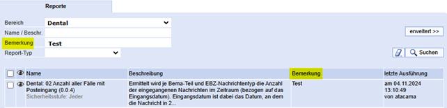 Im Bereich „Bemerkung“ können Sie individuelle Anmerkungen zu einem Report erfassen und speichern. Diese Bemerkungen sind dann nicht nur in der Übersicht sichtbar, sondern können auch gezielt über die Suchfunktion gefiltert werden.