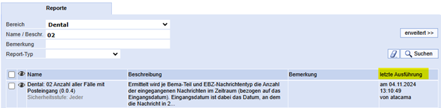 Nach der Ausführung eines Reports wird unter „letzte Ausführung“ protokolliert, wer den Report wann zuletzt genutzt hat. So behalten Sie den Überblick über die Nutzungshistorie und können sicherstellen, dass Sie den gewünschten Report verwenden.